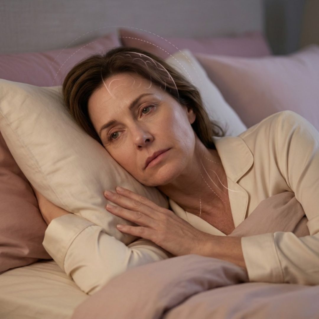 As estrogen and progesterone decline during menopause, the body’s sleep wake cycle can become less stable. These hormonal changes may also affect cortisol regulation and nervous system calm, making it harder to fall asleep, stay asleep, or wake feeling restored.